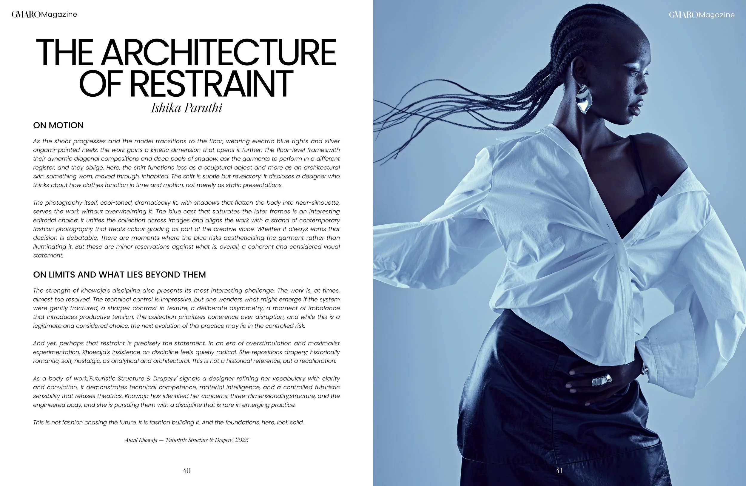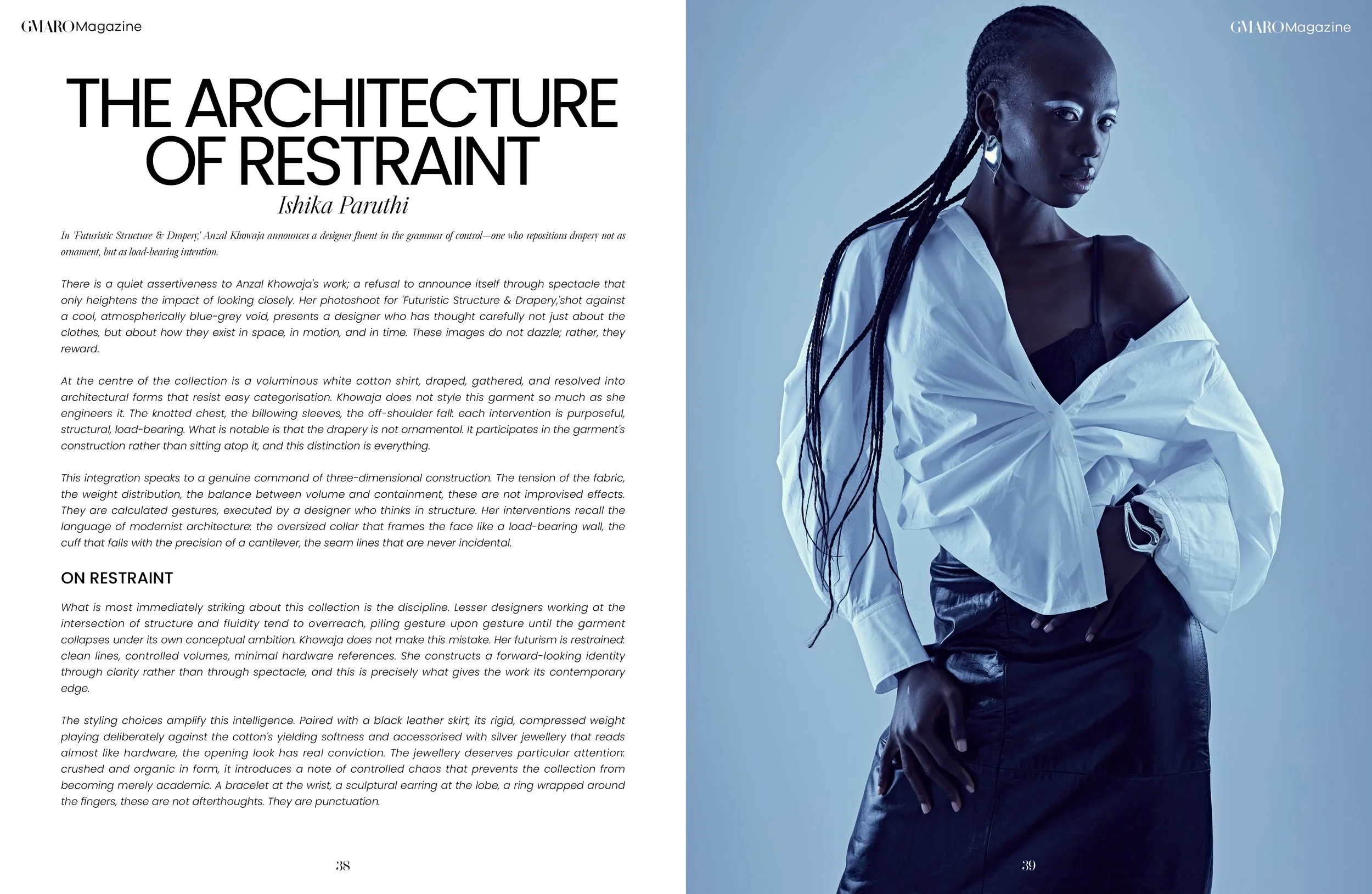 There is a quiet assertiveness to Anzal Khowaja's work; a refusal to announce itself through spectacle that only heightens the impact of looking closely. Her photoshoot for 'Futuristic Structure & Drapery,'shot against a cool, atmospherically blue-grey void, presents a designer who has thought carefully not just about the clothes, but about how they exist in space, in motion, and in time. These images do not dazzle; rather, they reward.