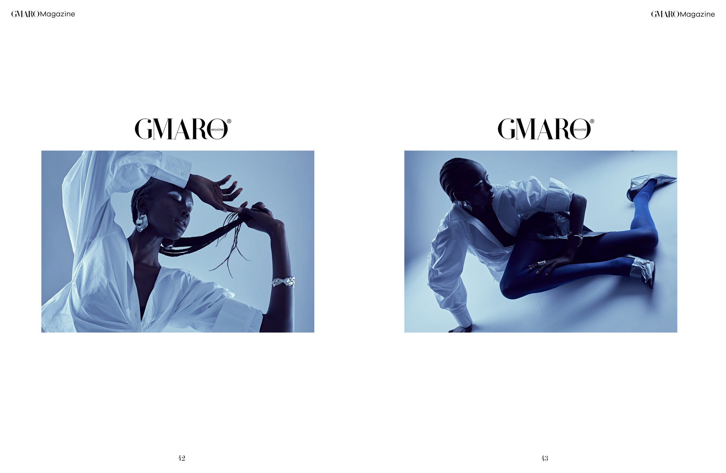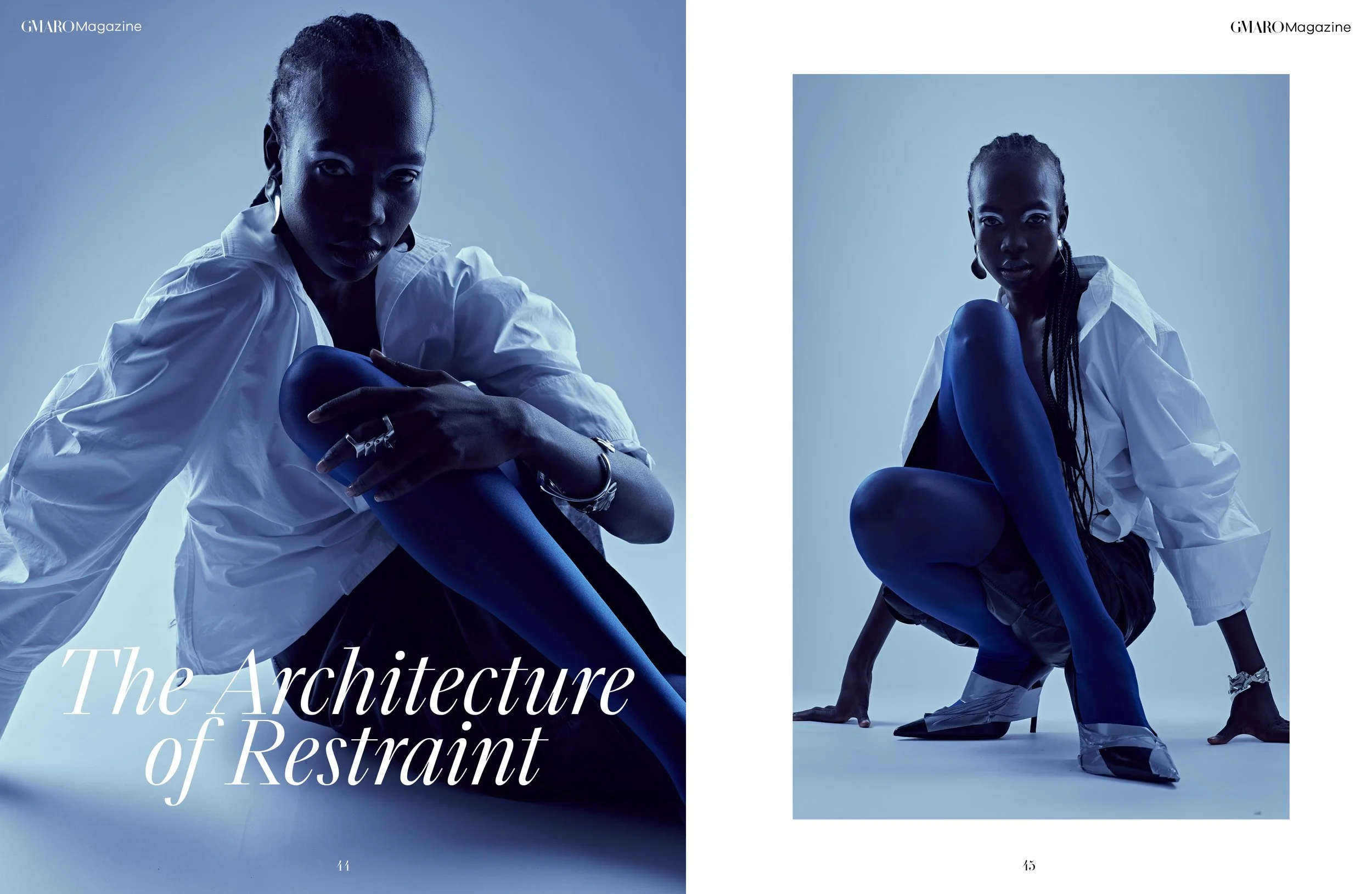 As the shoot progresses and the model transitions to the floor, wearing electric blue tights and silver origami-pointed heels, the work gains a kinetic dimension that opens it further. The floor-level frames,with their dynamic diagonal compositions and deep pools of shadow, ask the garments to perform in a different register, and they oblige. Here, the shirt functions less as a sculptural object and more as an architectural skin: something worn, moved through, inhabited. The shift is subtle but revelatory. It discloses a designer who thinks about how clothes function in time and motion, not merely as static presentations.